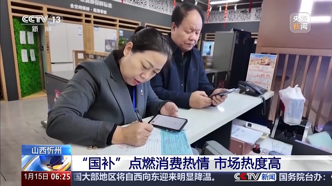 随着“国补”政策落地,山西省的消费市场也很火热。在忻州市城区的一家家电专卖店内,工作人员正协助消费者核销“国补”消费券。